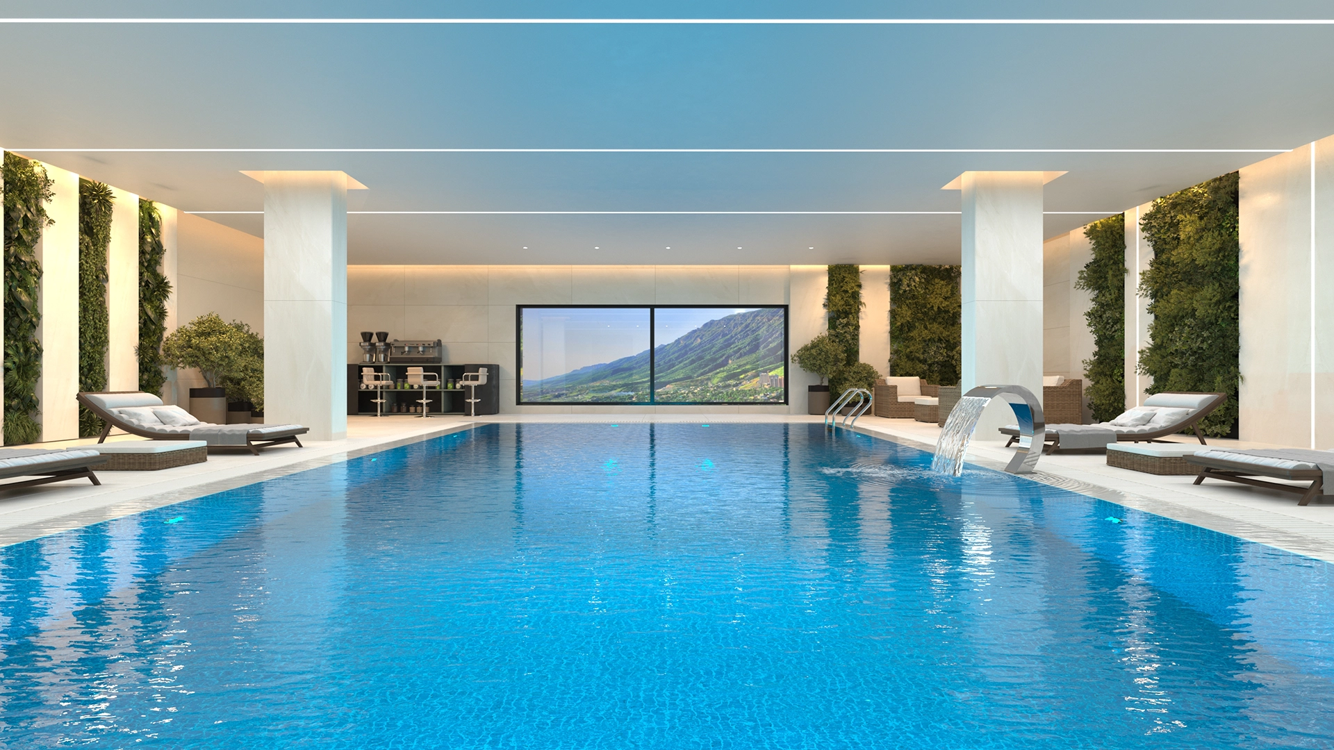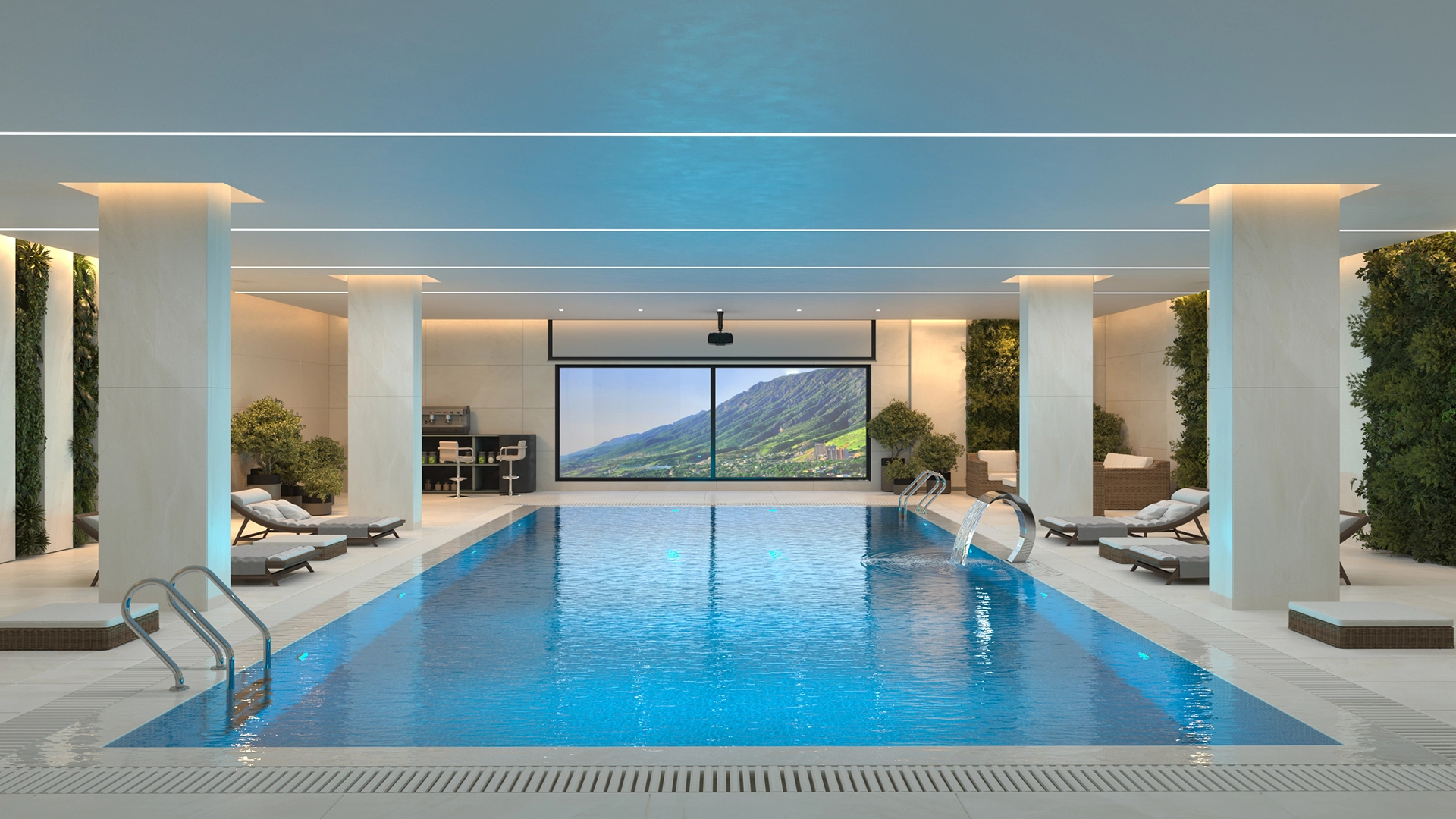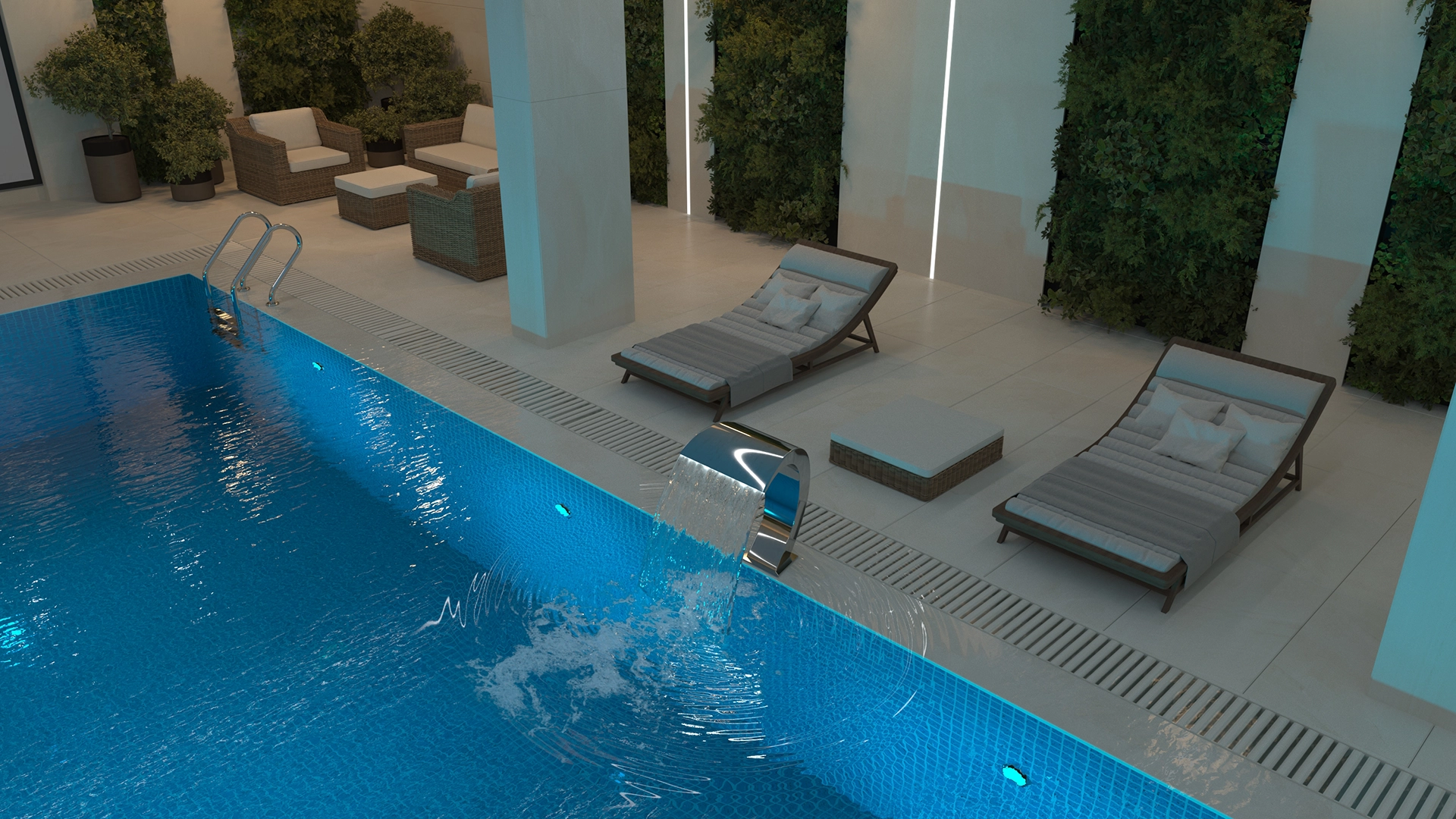 The design features a sleek swimming pool that complements the surrounding architecture. It offers both relaxation and a visual focal point.