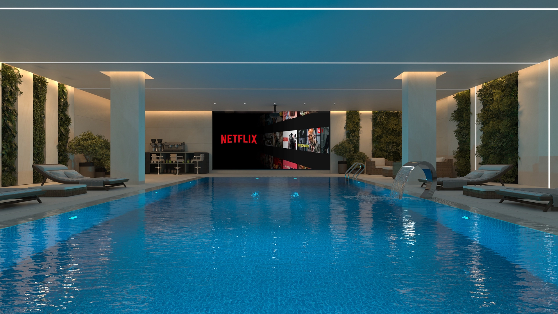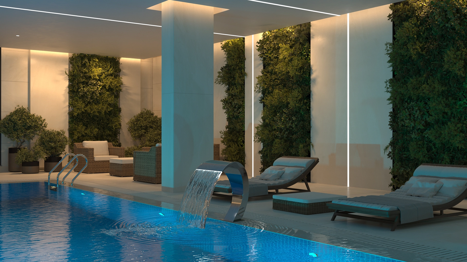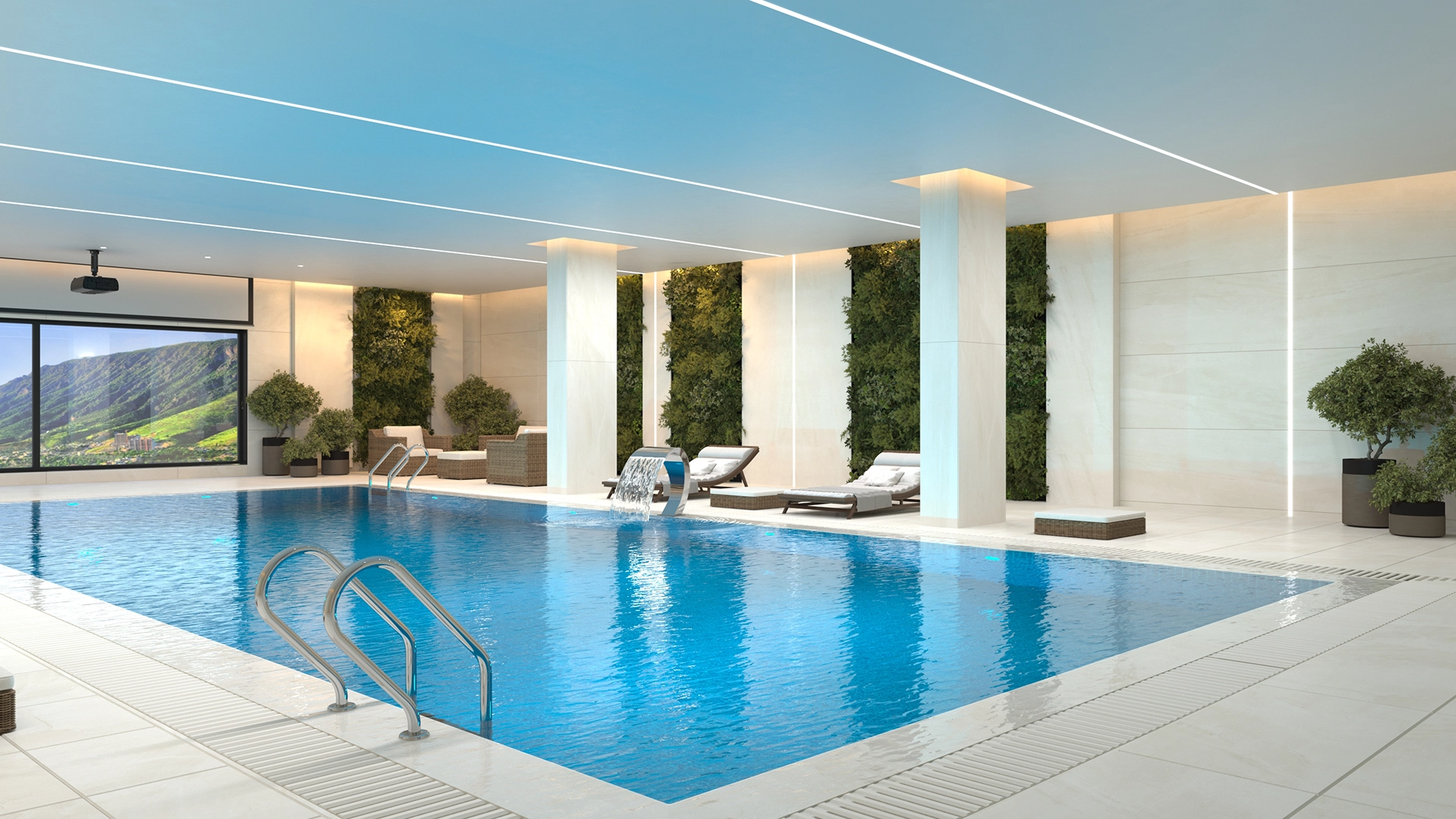 The design features a sleek swimming pool that complements the surrounding architecture. It offers both relaxation and a visual focal point.